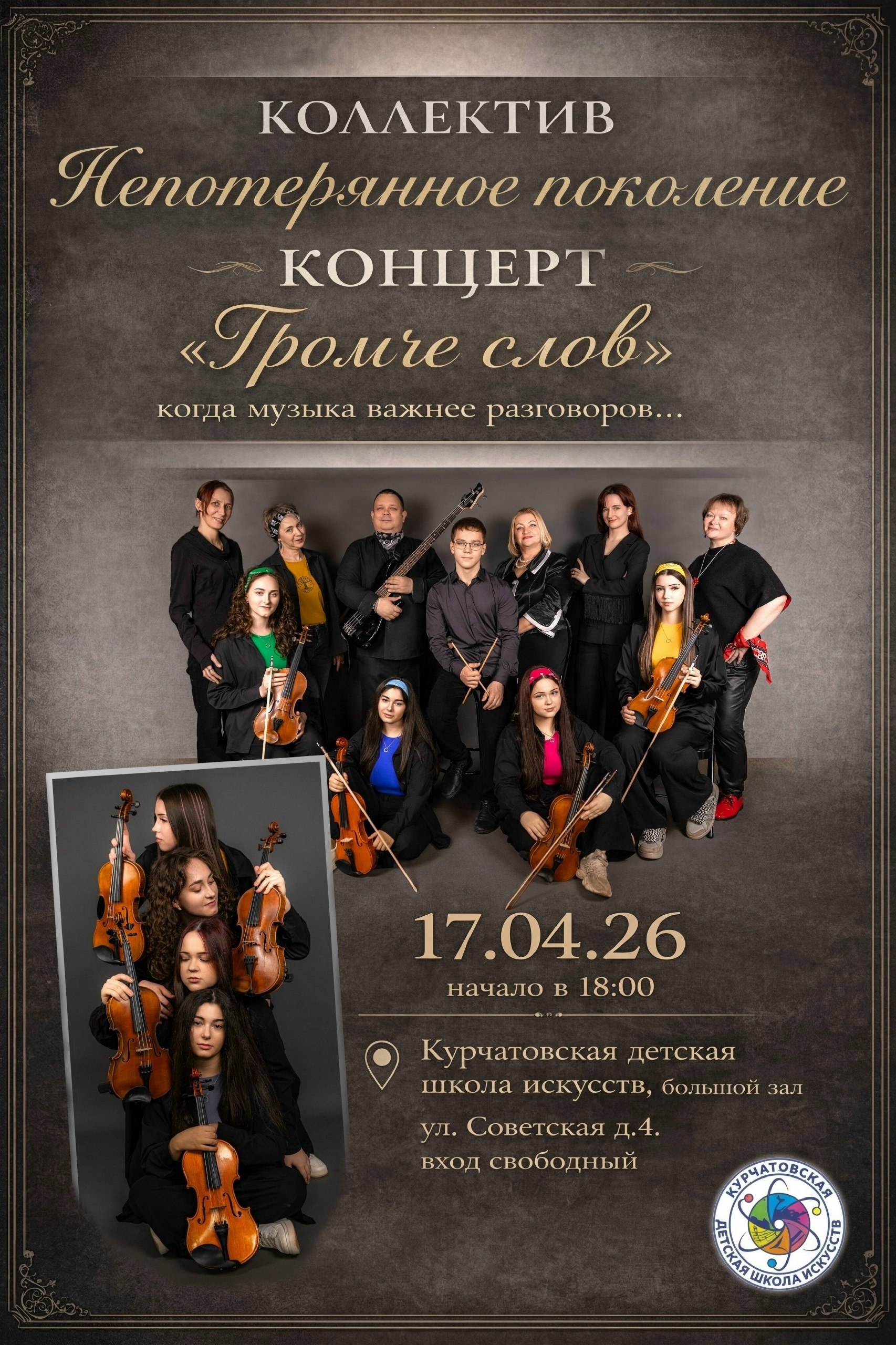 Дорогие друзья, мы приглашаем Вас на сольный концерт коллектива «Непотерянное поколение» , который состоится 17 апреля в 18:00 в большом зале МКОУ ДО «Курчатовская ДШИ».