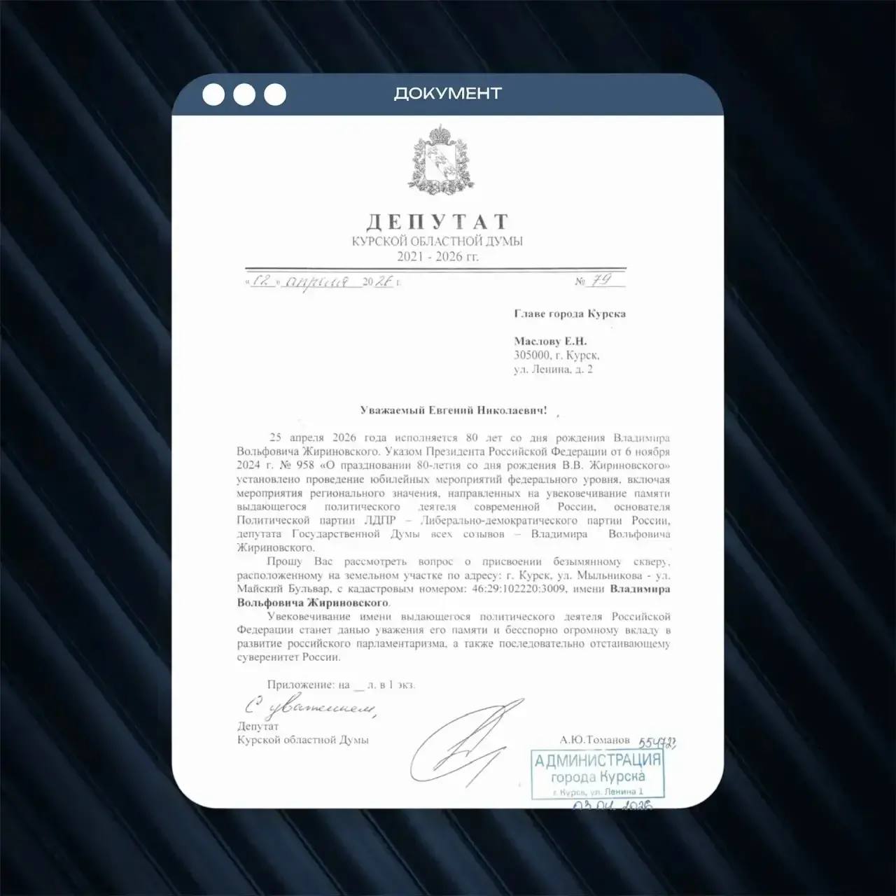 Обратился к главе города Курска Евгению Маслову с инициативой присвоить безымянному скверу, расположенному на пересечении ул. Мыльникова и Майского бульвара имя Владимира Вольфовича Жириновского.