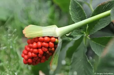 Другое распространенное растение — аризема единокровная (Arisaema consanguineum), достигающая 60 см в высоту. Эту аризему выделяют фиолетовые пятна на стеблях и пальчатые листья с длинными сегментами. Цветки, расположенные на одной высоте с листьями, имеют уникальную окраску и завершаются изящным «хвостом», который явно выделяет это растение среди других.