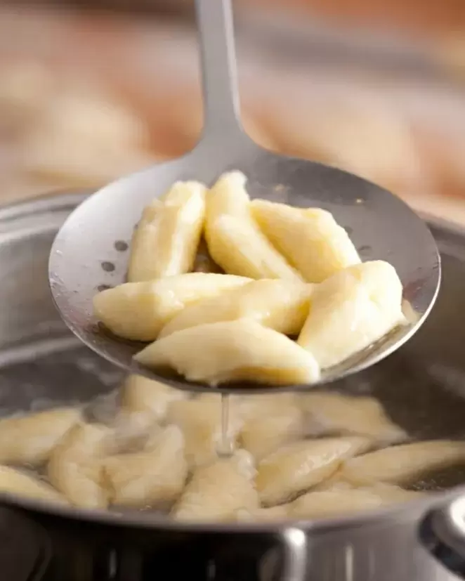 - На слегка муком припылённом столе раскатать тесто в жгут, нарезать на небольшие кусочки и бросить в кипящую подсоленную воду.