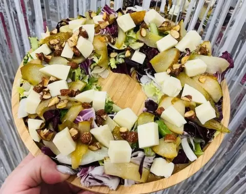 Для начала груши обжариваются с маслом и сахаром. В глубоком блюде выкладываются листья салата, сверху распределяются кусочки груши и сыра, после чего посыпаются орехами и заправляются приготовленным соусом. Это произведение кулинарного искусства решительно покорит сердца ваших гостей.