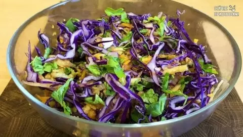 1. Начнем с краснокочанной капусты: мелко шинкуем ее и помещаем в салатник. Для более приятной текстуры можно слегка помять капусту с щепоткой соли.