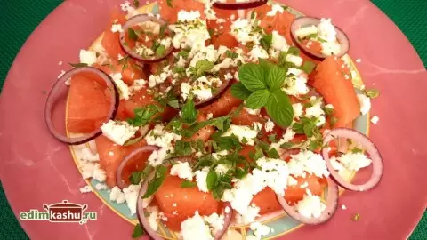Приступим к созданию этого кулинарного чуда. Первым делом, мякоть арбуза нужно нарезать на небольшие кусочки и удалить семечки. Затем выложите их на красивое блюдо или небольшие тарелки. Теперь пора заняться красным луком – его следует нарезать кольцами и равномерно разложить по арбузу.