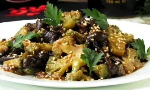На следующем этапе в сковороду с брокколи и грибами добавляются соевый соус, сладкое вино, разведённый крахмал, смесь перцев и чуть-чуть тмина. Все ингредиенты необходимо тщательно перемешать и дать соусу слегка загустеть перед тем, как снять с огня.