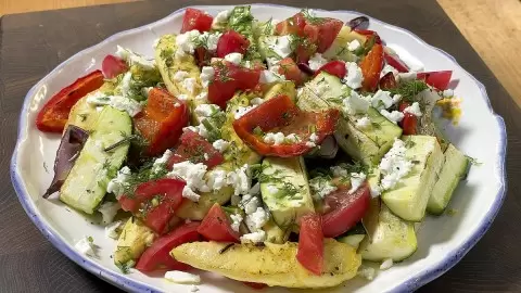 На сервировочную тарелку выложите курицу и запеченные овощи, добавьте крупно нарезанный помидор, посыпьте сыром и свежей зеленью. Не забудьте обильно полить блестящей медово-имбирной заправкой. Это блюдо не только порадует глаз, но и удивит вкусом, став настоящим угощением для всех!. Приготовление такого салата — это легкость, быстрое время нарезки и чувство удовлетворения от созданного кулинарного чуда.
