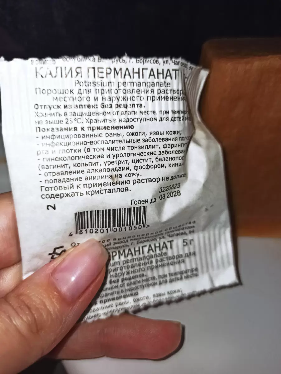 - Марганцовка: Разведите несколько кристаллов в воде так, чтобы раствор приобрел бледно-розовый оттенок.