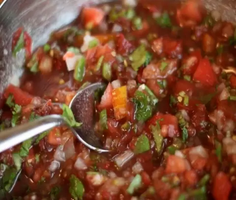 Приготовление этого соуса не потребует много усилий. Для начала очищенные лук и помидоры нарезать: лук — мелкими кубиками, помидоры — дольками, а острый перец — мелко покрошить. Зеленые перцы следует нарезать тонкими полукольцами. Все подготовленные овощи складываются в кастрюлю, после чего добавляется томатная паста, уксус, чеснок, соль, кайенский перец, тмин и оба вида сахара. Затем смесь тщательно перемешивается и готовится на среднем огне в течение примерно трех часов, пока не загустеет.