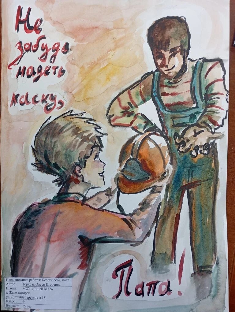 Девятиклассница Лицея №12 города Железногорска Олеся Торхова представила на областном конкурсе рисунков «Охрана труда глазами детей» свою работу под названием «Береги себя, папа!». Её творческое и трогательное послание не оставило жюри равнодушным — Олеся заняла второе место!