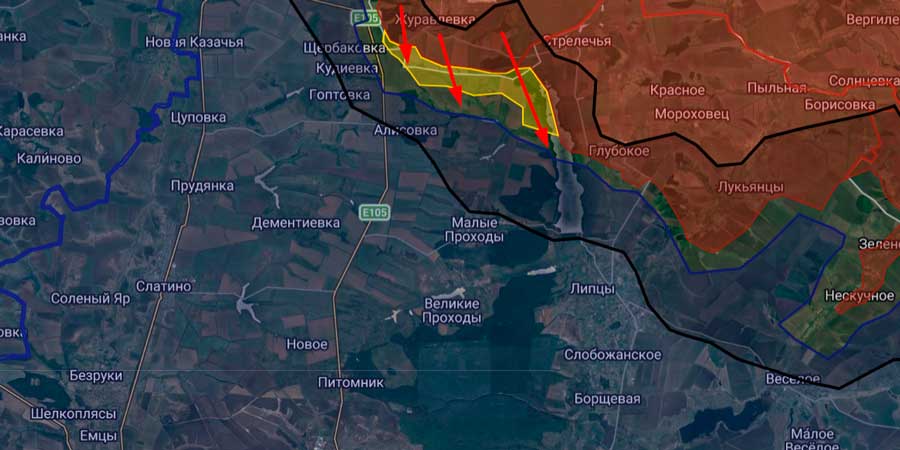 Дополнительно отмечается закрепление вдоль реки Травянка, на участке западнее трассы. Это уже формирование естественного рубежа, который можно использовать как базу для накопления сил и последующего рывка.