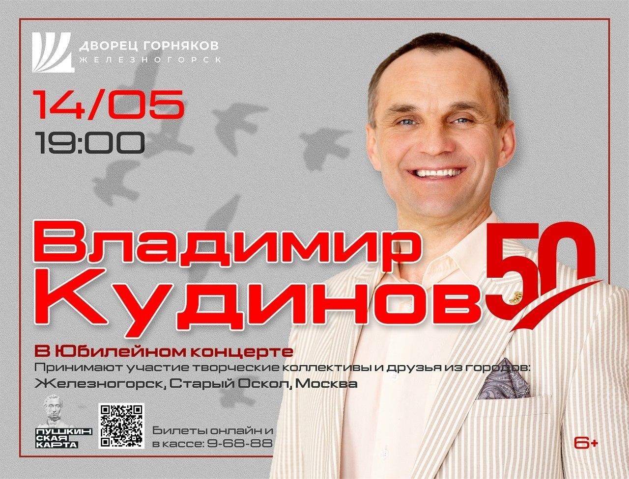 50Долгожданный концерт Владимира Кудинова – любимого артиста железногорской публики, пройдет 14 мая в Юбилейный день его рождения.