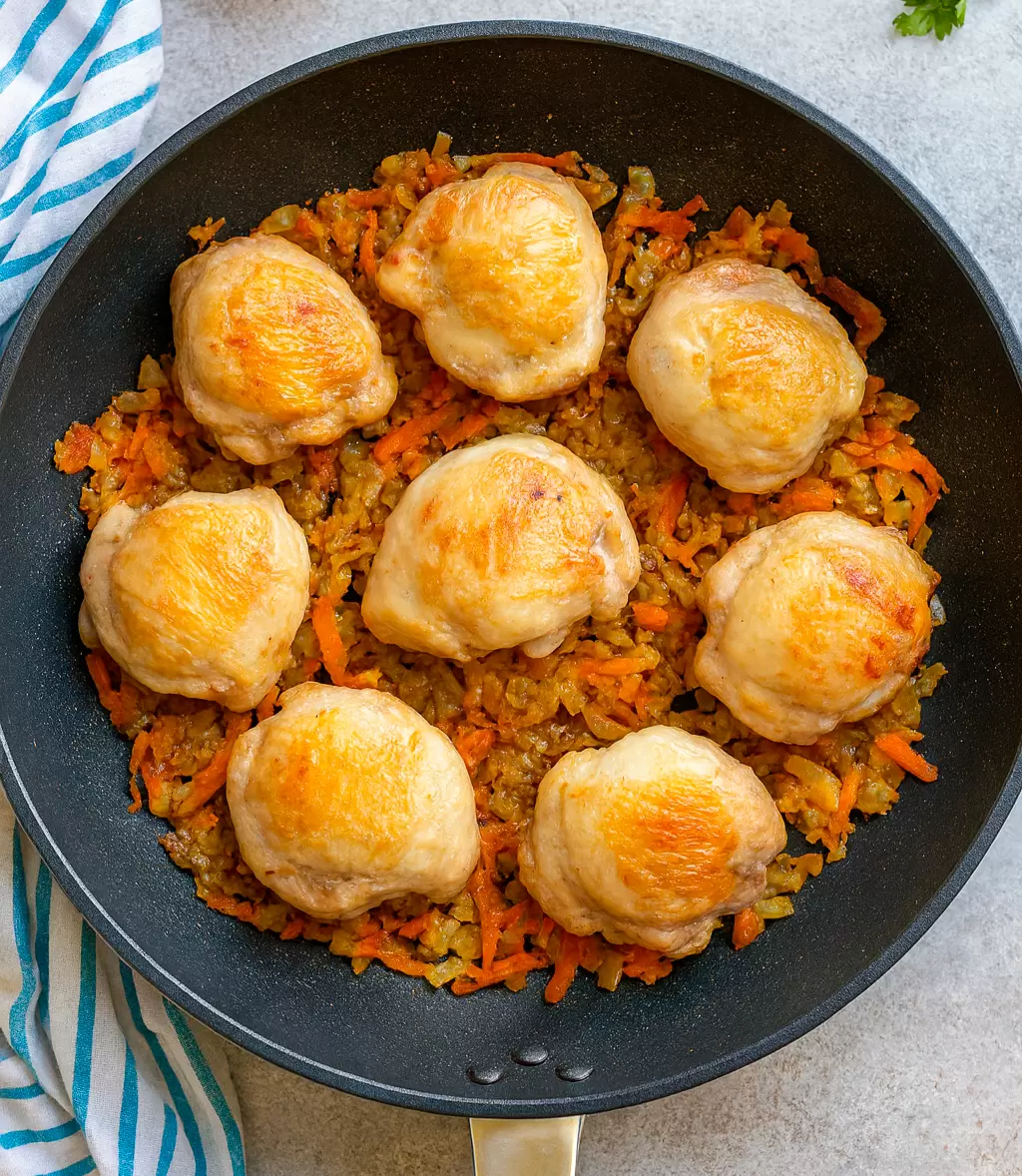1. Обжаривание курицы: В глубокой сковороде с высокими бортиками разогреть растительное масло на среднем огне. Куриные бедра предварительно высушить бумажным полотенцем и обжарить до золотистой корочки с обеих сторон. После обжаривания курицу переложить в отдельную посуду.