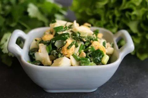 Положите мелко нарезанный лук на сковороду и обжаривайте его до тех пор, пока он не уменьшится в объеме, при этом помешивая. Когда лук станет мягким, сразу уберите сковороду с огня. Тем временем варите яйца вкрутую, затем остудите, очистите и нарежьте кубиками.