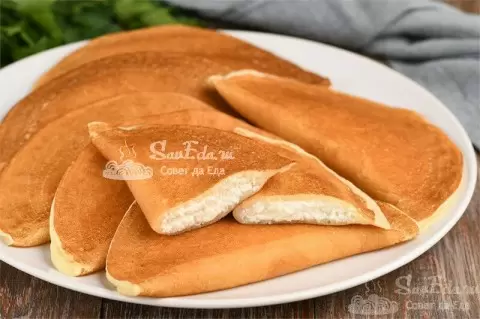 Разогреваем сковороду с растительным маслом и выливаем тесто, придавая ему форму округлого блинчика диаметром около 15 см. Когда поверхность блинчика начинает матоветь, добавляется начинка. Затем, аккуратно поддев одну половину блинчика, его следует сложить пополам, плотно прижимая края, чтобы начинка не вытекала во время жарки.