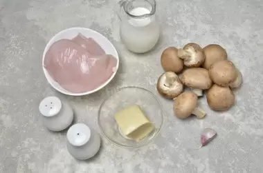 Приготовление соуса: Пока курица жарится, займитесь грибами. Оботрите шампиньоны влажной губкой и нарежьте их на кусочки. На отдельной сковороде обжарьте нарезанный чеснок, уберите его после аромата, и добавьте грибы. Жарьте до полного испарения жидкости, затем влейте сливки, добавьте натертый сыр и прокипятите, помешивая, до однородной консистенции.