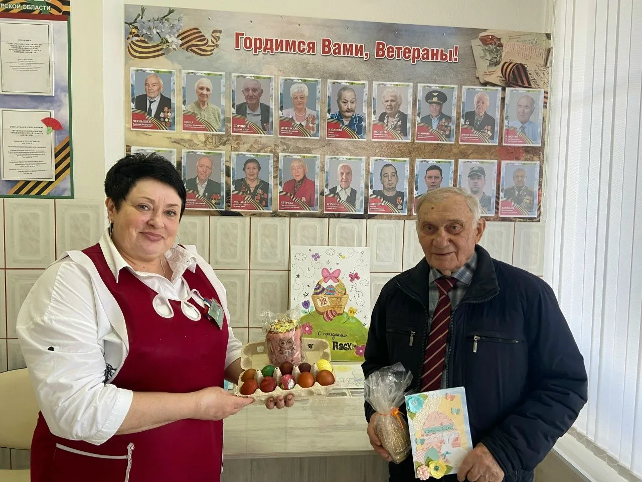 Всю Светлую Седмицу сотрудники учреждения "Ветеран" продолжали поздравлять получателей социальных услуг, вручая сладкие подарки и поздравительные открытки.