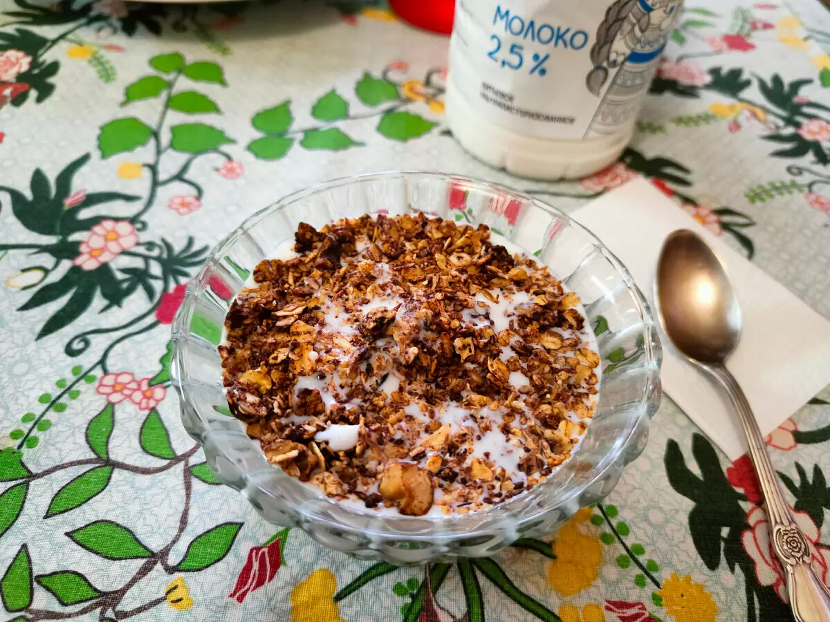 - Шоколадная гранола с молоком - идеальное начало дня.
