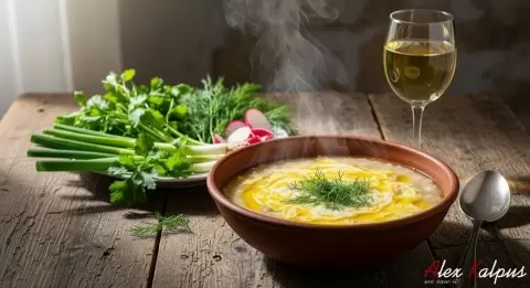 Суп следует подавать горячим в глиняных пиалах, дополнительно украсив свежими зелеными травами. Желательно также подготовить закуски: укроп, зеленый лук и петрушку. Для большей аутентичности к супу можно предложить мацони и закуски с мчади. Белое вино будет идеальным дополнением к этому блюду, подчеркивая его насыщенный вкус.