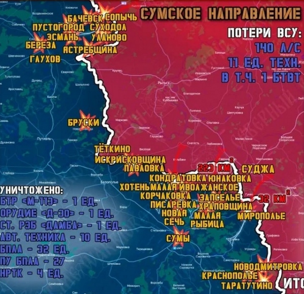 Наши войска били по скоплениям противника возле Бачевска, Мирополья, Новой Сечи, Павловки, Пустогорода, Хотени, Храповщины и Ястребщины,