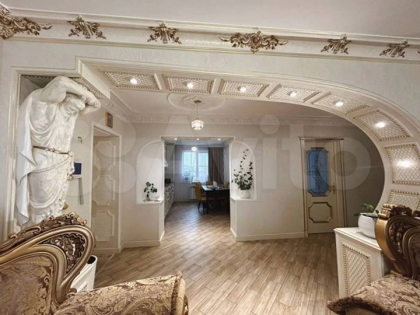На Авито на продажу выставлена пятикомнатная квартира на Майском бульваре в Курске за 20 миллионов рублей. В интерьере использован стиль барокко: гипсовая лепнина ручной работы, роспись на всю стену и камин с живым огнем.