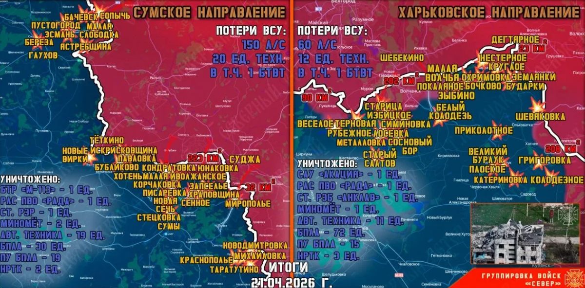 К утру 22 апреля группировка войск «Север» продолжила формирование полосы безопасности в Харьковской и Сумской областях Украины, в том числе на подступах к госгранице с Курской областью России.