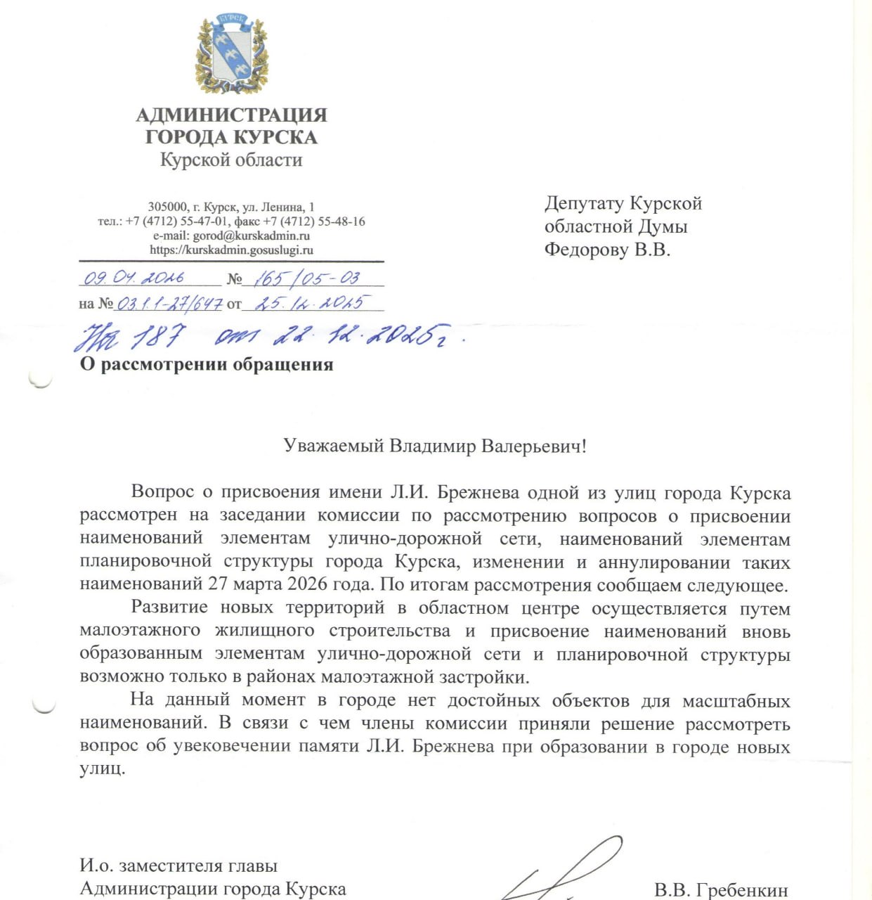 Депутат Курской областной думы Владимир Фёдоров сообщил, что комиссия при администрации Курска рассмотрела его предложение о присвоении одной из улиц города имени бывшего генсека Леонида Брежнева.