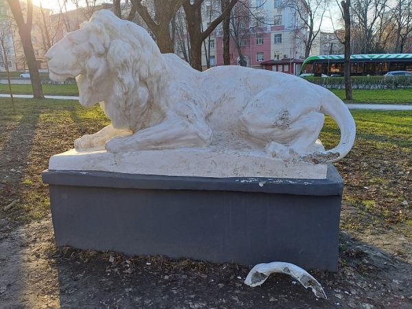 В Парке пионеров на улице Перекальского, который в прошлом году благоустроили, повреждена одна из бетонных скульптур — у льва отвалиилась часть хвоста, она валяется на земле.