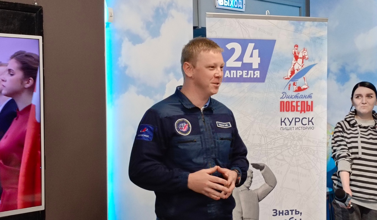 Вместе с губернатором Курской области Александром Хинштейном «Диктант Победы» на площадке музея Юных защитников Родины пишет космонавт-испытатель, уроженец Железногорска Александр Горбунов.