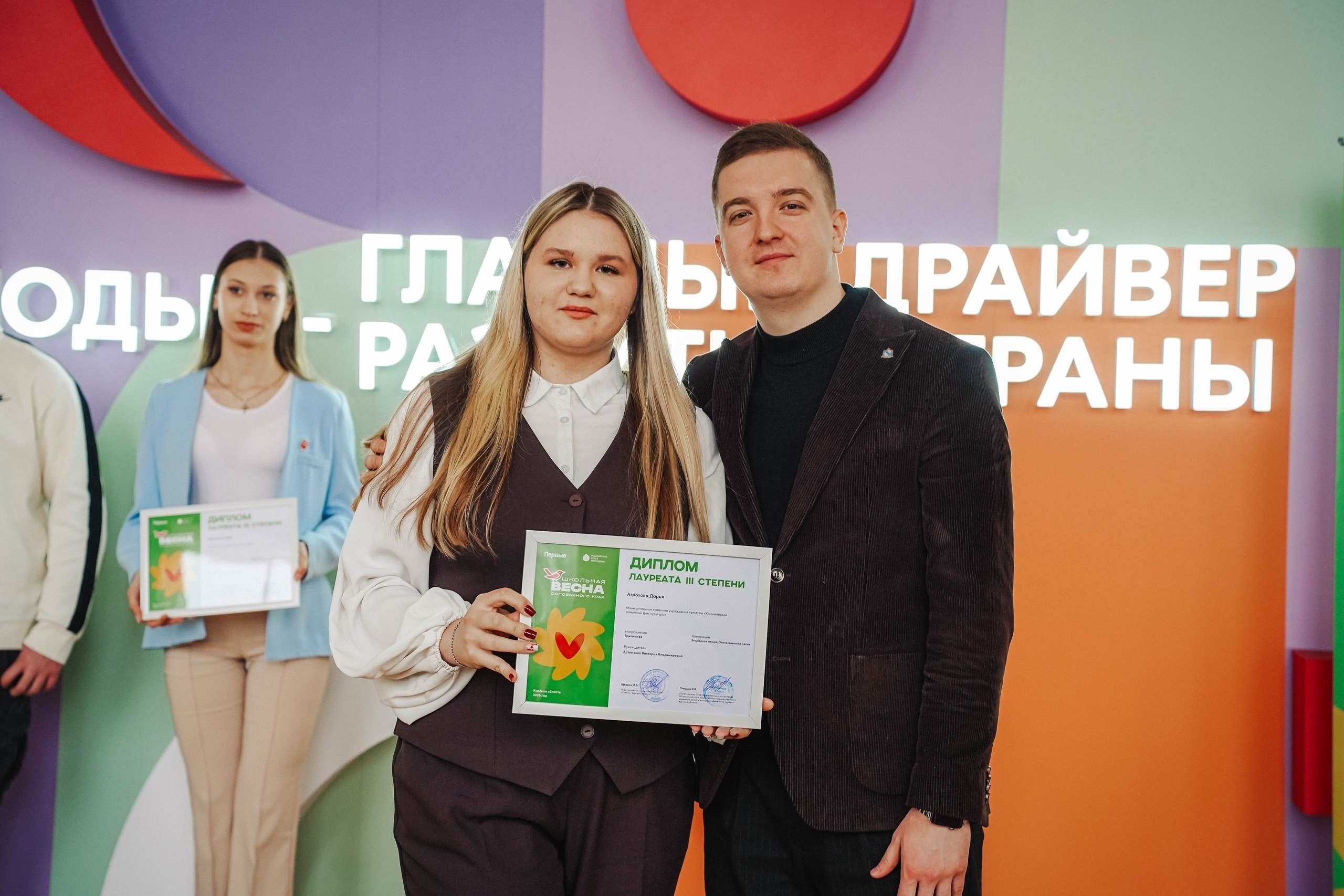 Среди награжденных – конышевские талантливые участницы художественной самостоятельности "Конышевского Дома культуры " Дарья Атрохова и Вероника Стрижакова. Девушки были удостоены Дипломов лауреатов III степени, в номинации «Эстрадное пение. Отечественная песня».