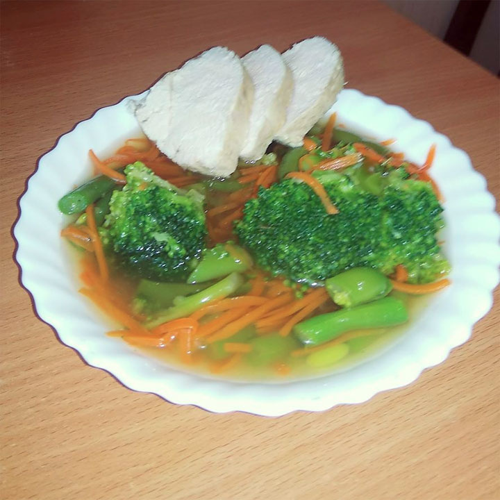Для начала куриную грудку следует отварить. После того как она будет готова, её стоит вынуть из бульона. В оставшийся бульон добавляют нарезанный лук, фасоль, мелко нарезанную тыкву и капусту брокколи.