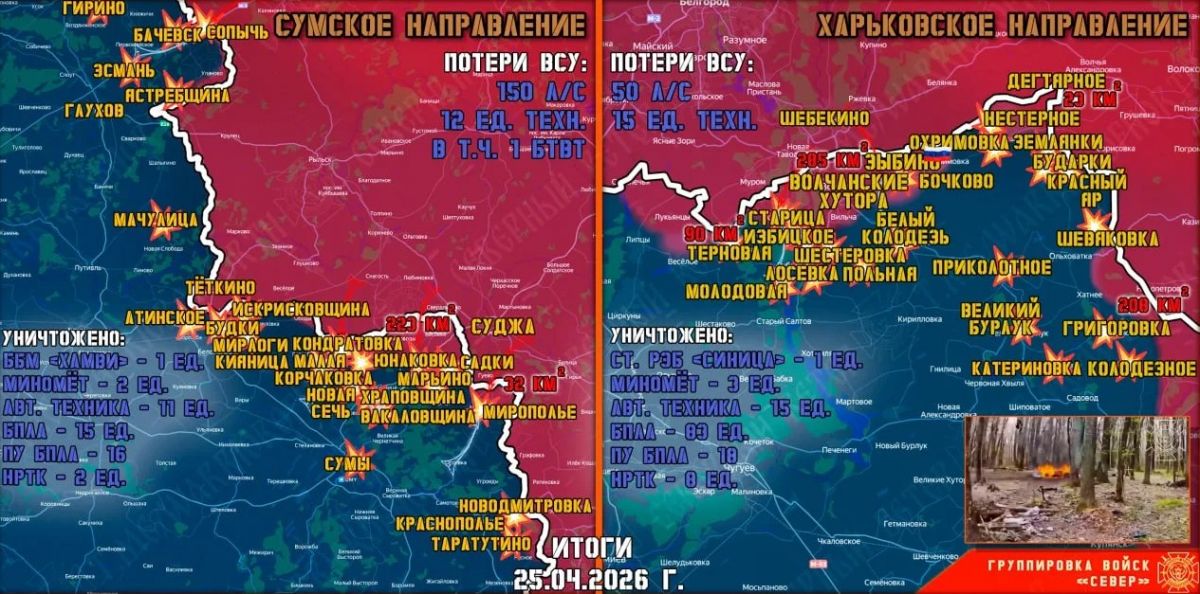 К утру 26 апреля группировка войск «Север» раскрыла новые подробности формирования полосы безопасности в Харьковской и Сумской областях Украины, в том числе на подступах к госгранице с Курской областью России.