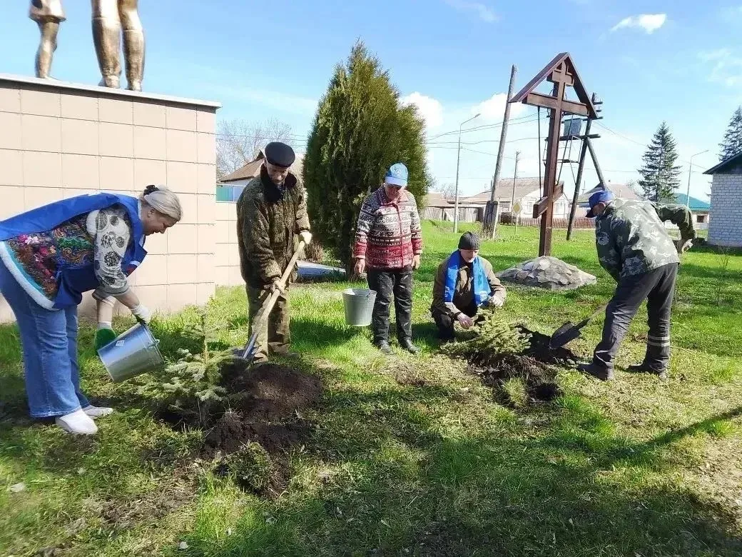 «Завершилась серия мероприятие высадкой голубых елей у памятника погибшим односельчанам в годы Великой Отечественной войны»,