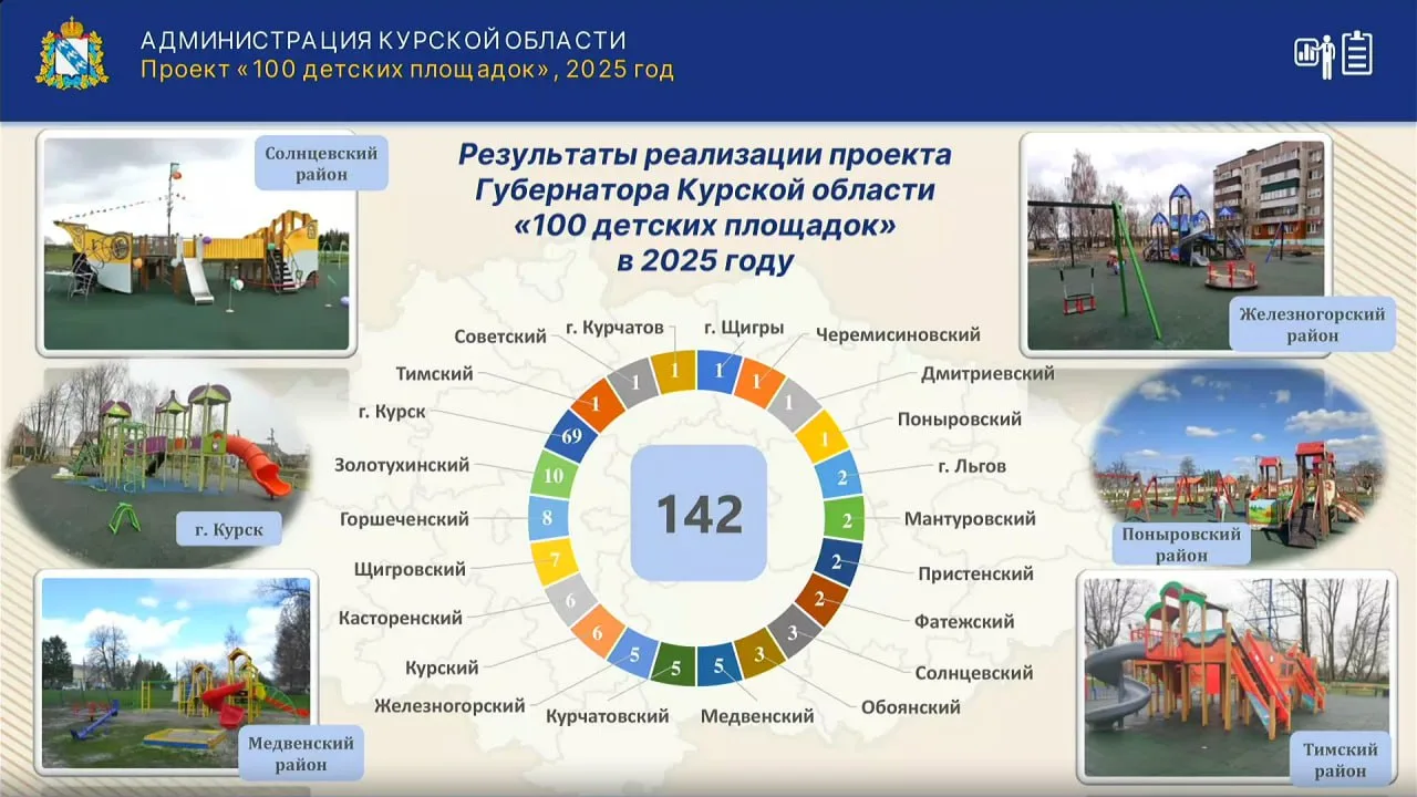 В правительстве области подвели итоги реализации проекта губернатора «100 детских площадок». Больше всего площадок - 69 - появилось в Курске. На втором месте Золотухинский район - там установили 10.