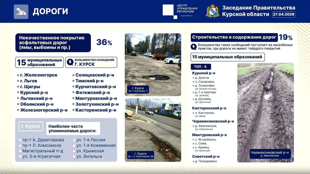 Статистикой обращений курян за период с 18 до 24 апреля поделился глава курского ЦУР Григорий Цуканов.