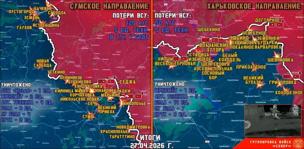 К утру 28 апреля группировка войск «Север» продолжила расширять полосу безопасности в Харьковской и Сумской областях Украины, в том числе на подступах к госгранице с Курской областью России.