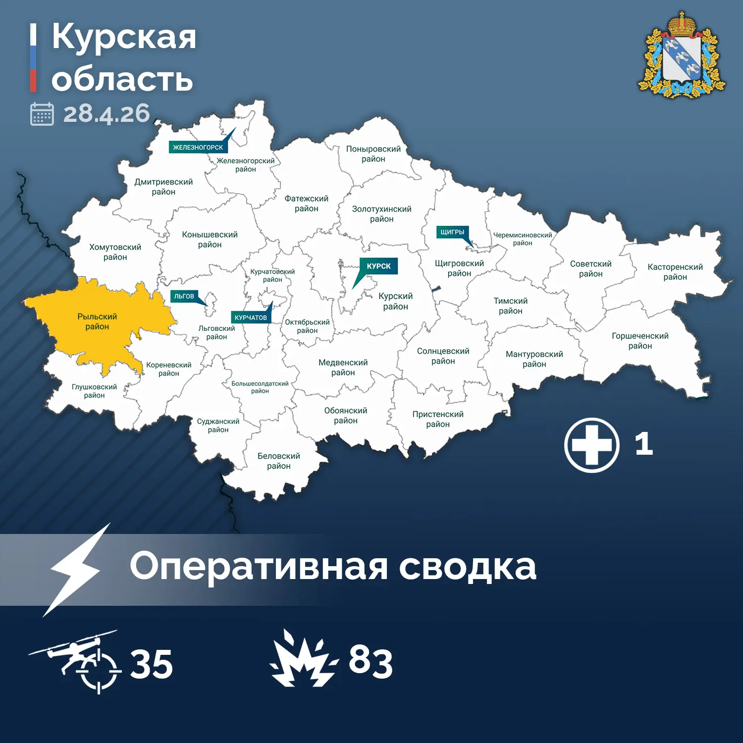 «Всего в период с 9:00 27 апреля до 9:00 28 апреля сбито 35 вражеских беспилотников различного типа. 83 раза враг применил артиллерию по отселённым районам.