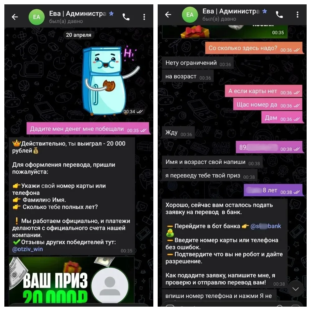 Схема началась с «выигрыша» в мессенджере. Под предлогом получения приза злоумышленники втянули ребенка в переписку, запросили данные, а затем начали поэтапно управлять его действиями. Использовались фиктивные чеки, имитация банковских уведомлений, запугивание «штрафами» и обращением в полицию.