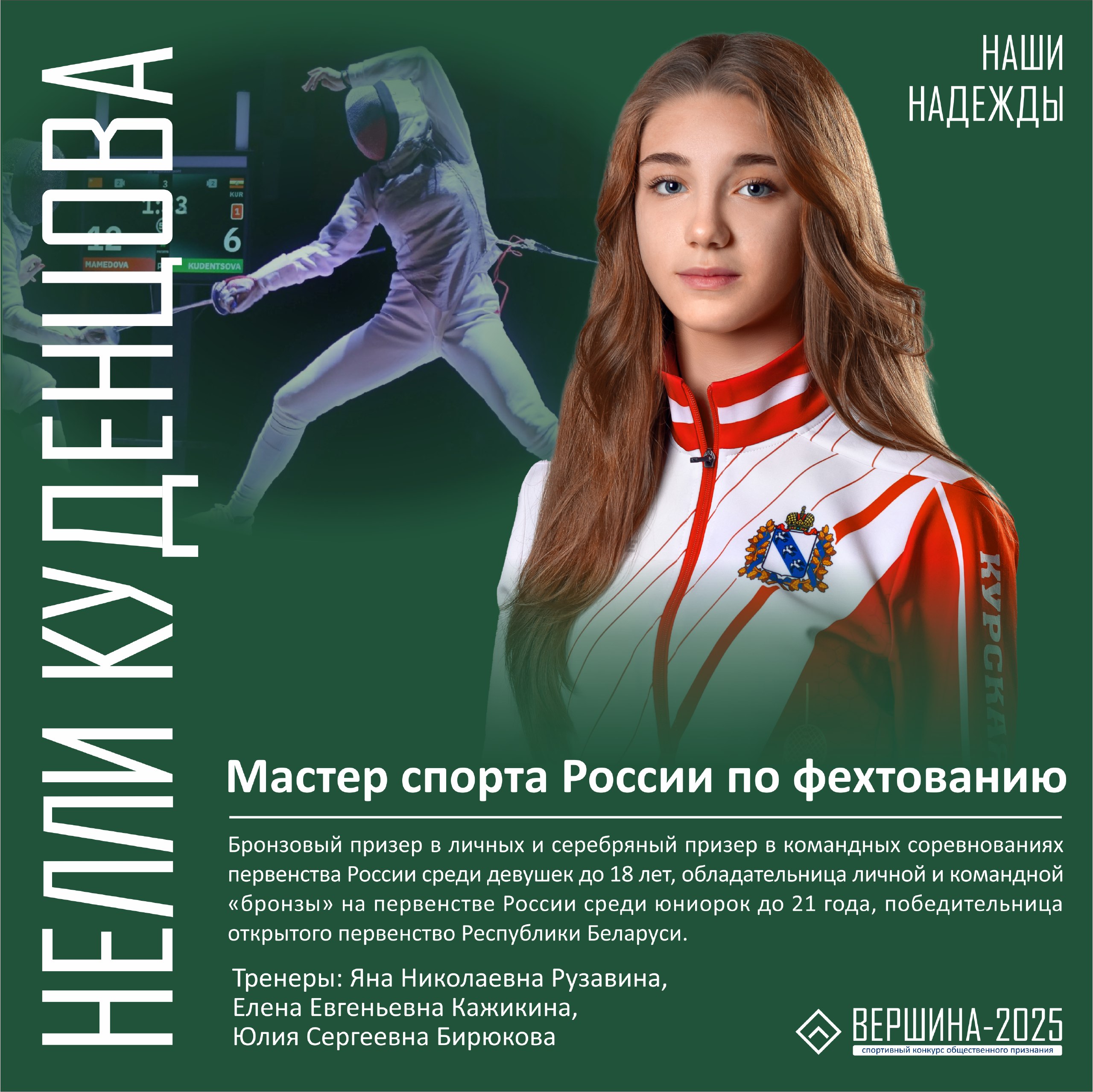 Рассказываем о сильнейших молодых курских спортсменах, которые были отмечены наградами областной премии общественного признания "Вершина". В этом году в списке лучших 15 чемпионов по 10 видам спорта: фехтованию, боксу, тяжелой атлетике, всестилевому каратэ, легкой атлетике, шахматам, дзюдо, конному спорту, баскетболу и танцевальному спорту.