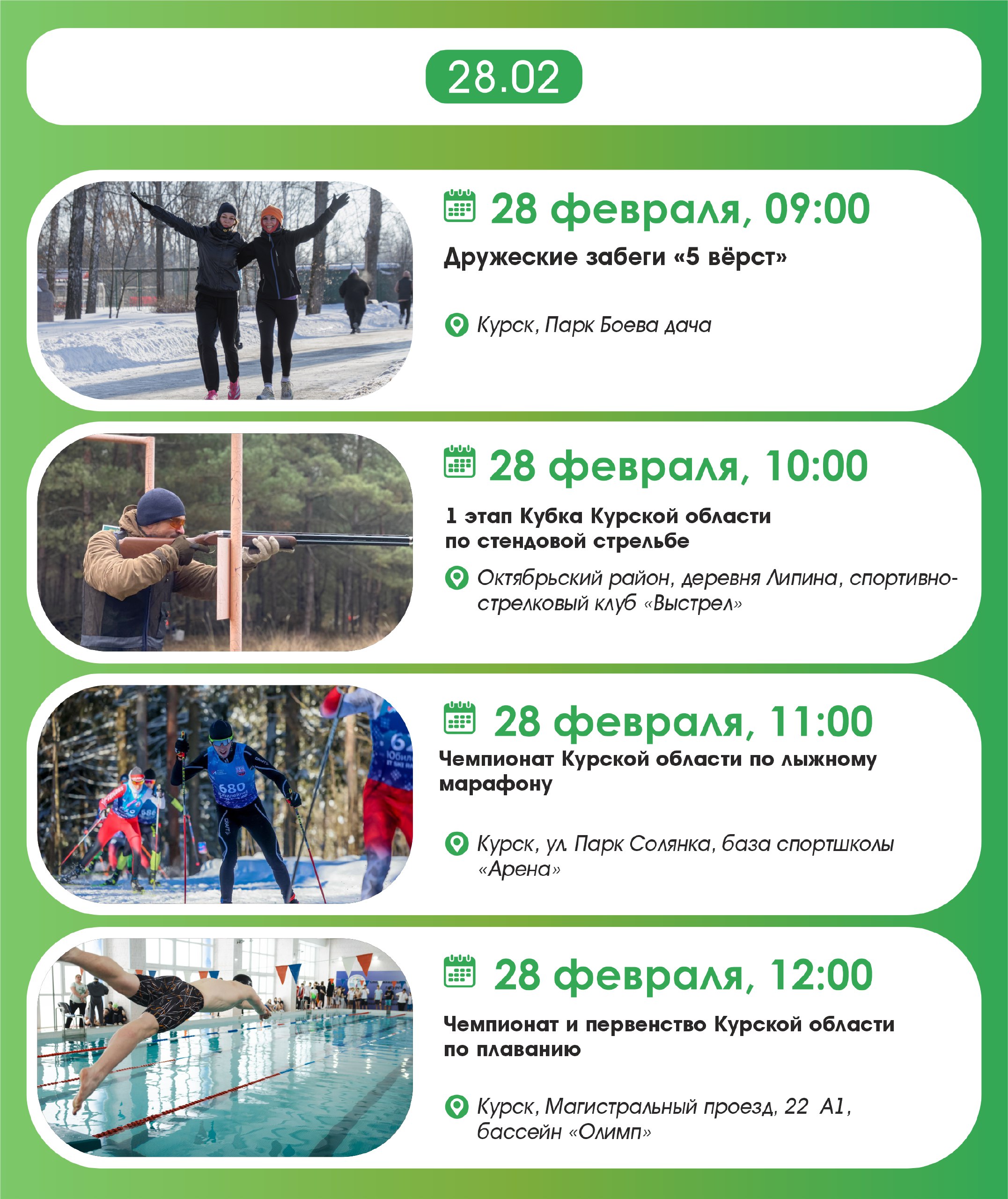 Впереди нас ждут два дня соревнований по самым разными видам спорта, в том числе закрытие лыжного сезона. Оно состоится в первый день весны! Изучаем нашу афишу.