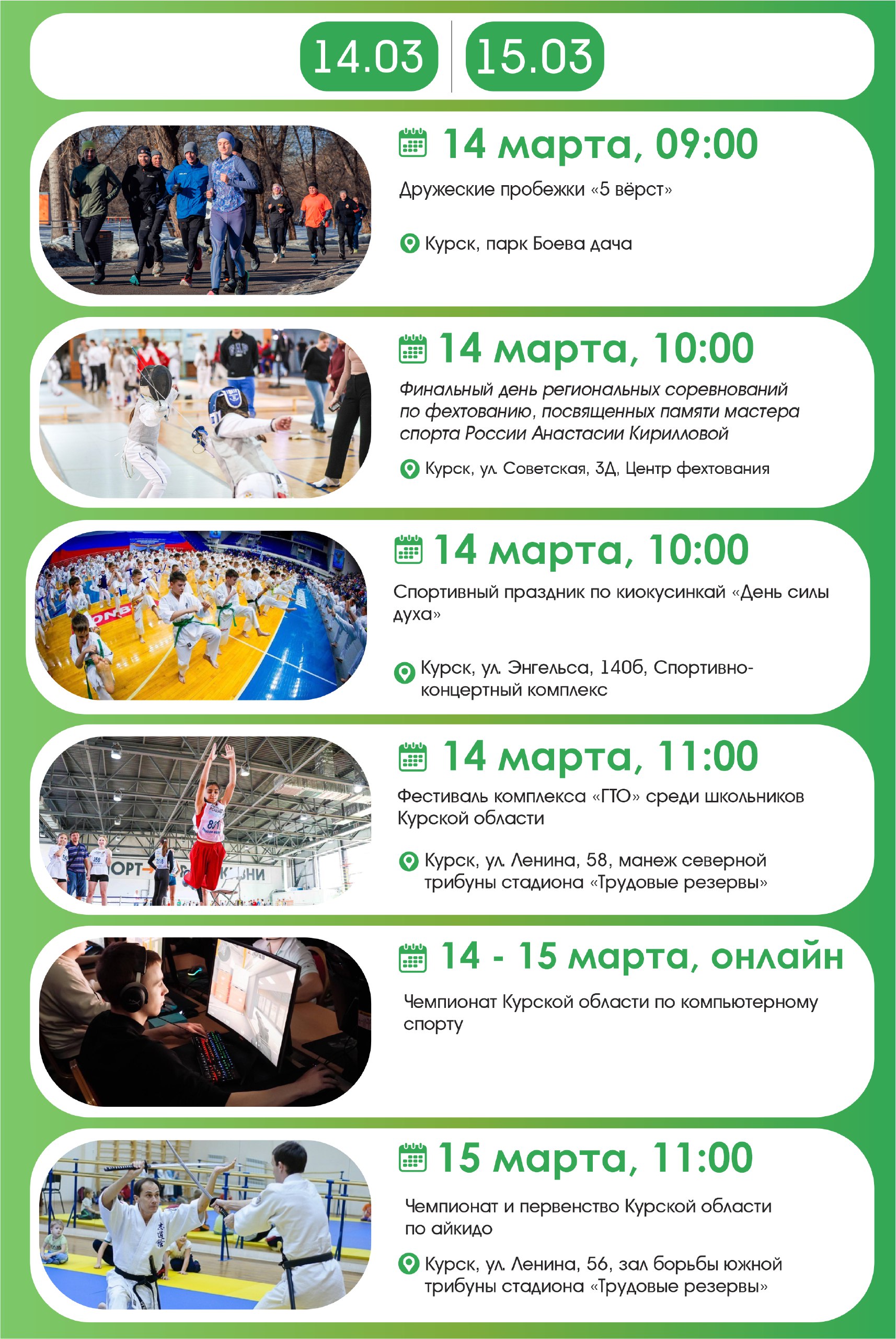 14 марта в Центре фехтования - финальный день регионального турнира, посвященного памяти мастера спорта России Анастасии Кирилловой, а на стадионе «Трудовые резервы» продолжим отмечать 95-летие комплекса «Готов к труду и обороне». Еще одно большое событие запланировано в СКК. Там состоится масштабный День силы духа.
