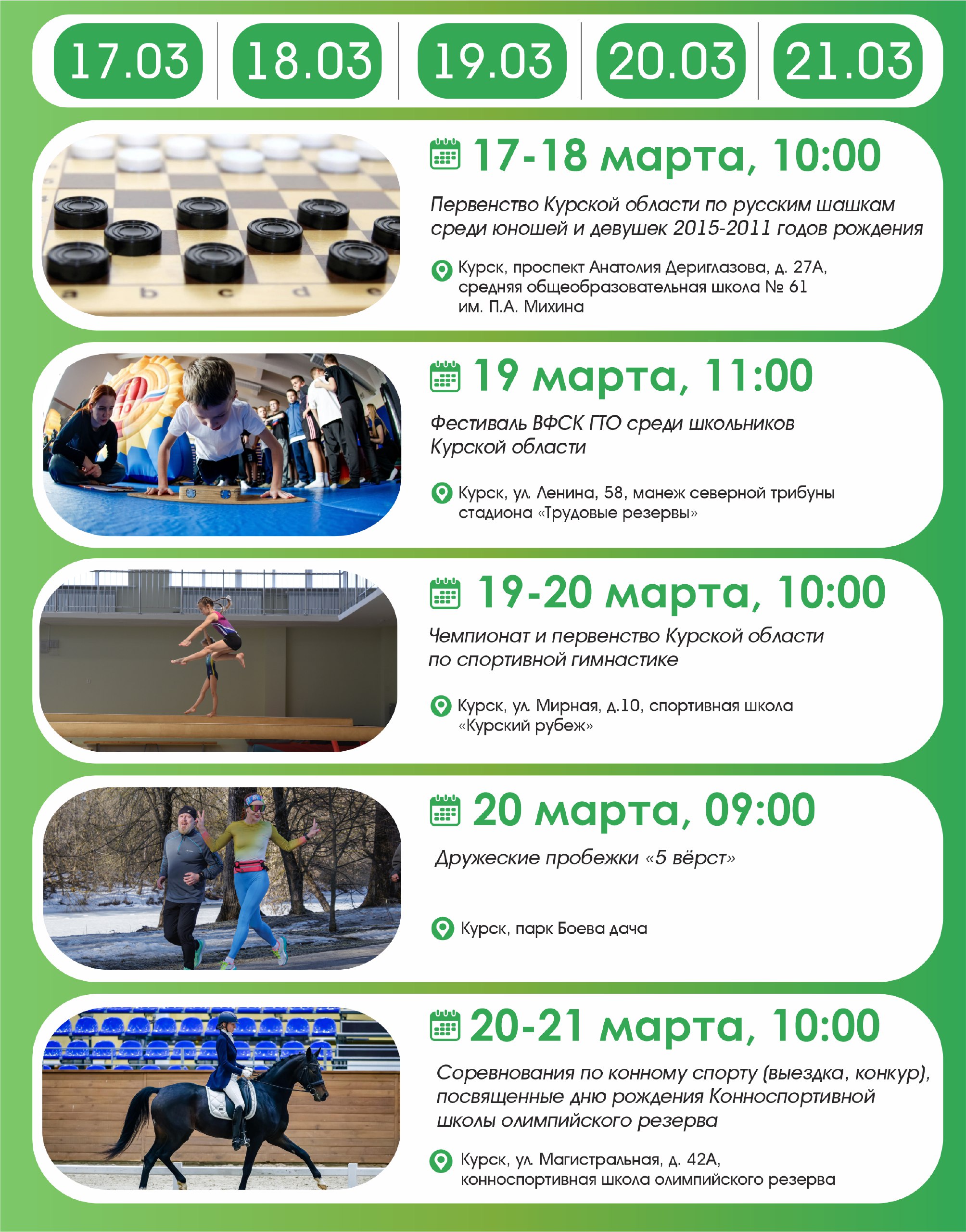 Не ждем выходных и делимся спортивными анонсами уже сегодня! У нас много событий. Например, сразу два соревнования по конному спорту, чемпионат и первенство области по спортивной гимнастике, турниры по дзюдо, русским шашкам, панкратиону, восточным боевым единоборствам, а также Кубок Черноземья по бодибилдингу и фестиваль ГТО.